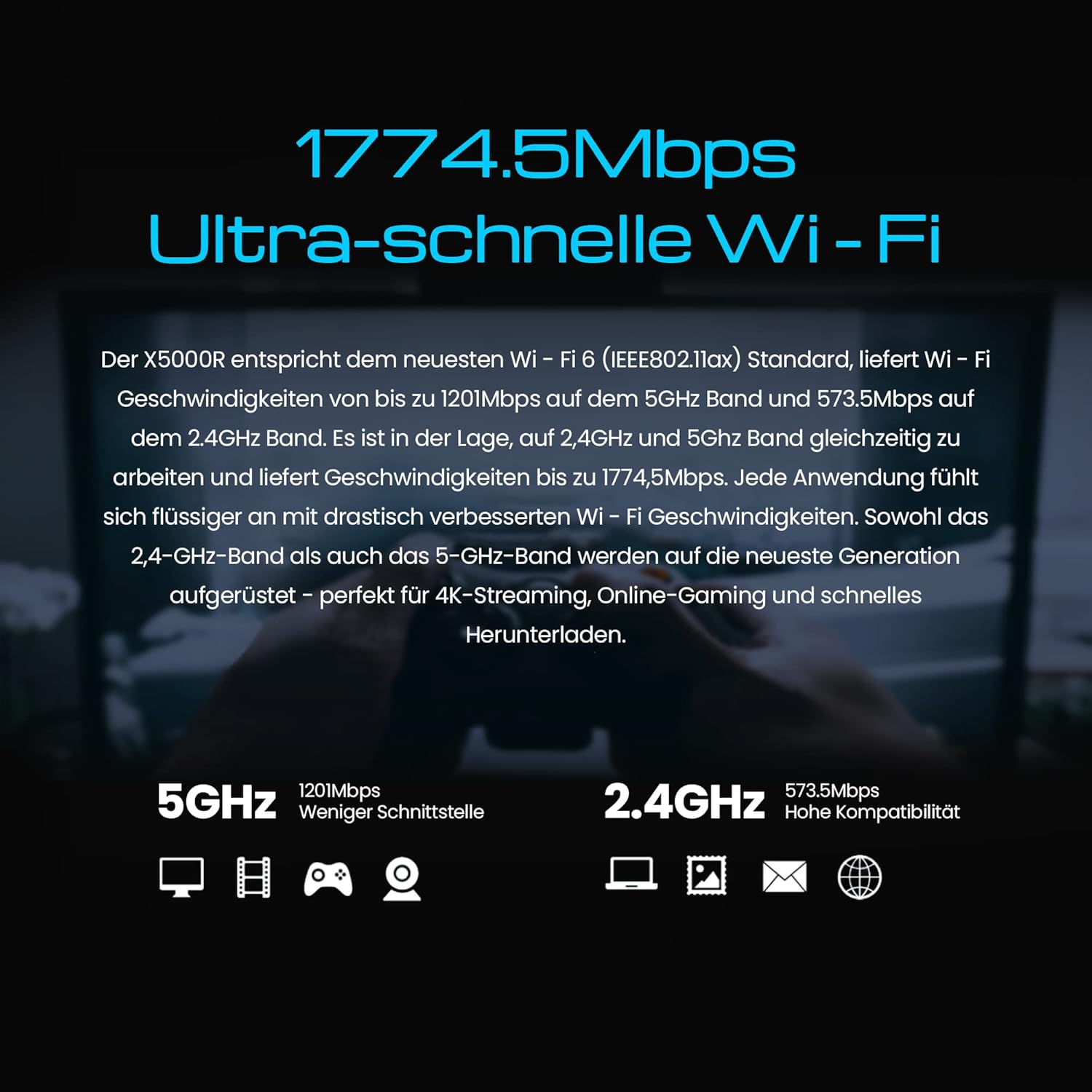 Der X5000R-Router unterstützt sowohl das 2,4-GHz- als auch das 5-GHz-Band, sodass neue und alte Geräte mit maximalen Datengeschwindigkeiten arbeiten können, was für ein reibungsloses Interneterlebnis wichtig ist.