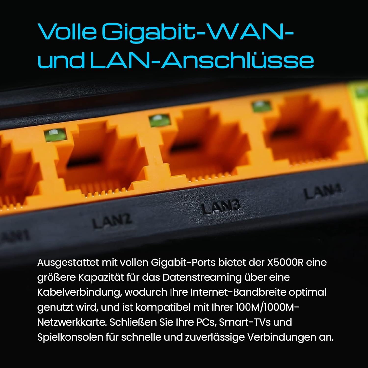 Ja, der X5000R ist mit vollwertigen Gigabit-Ports für schnelle und zuverlässige Kabelverbindungen ausgestattet, ideal für den Anschluss von PCs, Smart-TVs und Spielekonsolen.