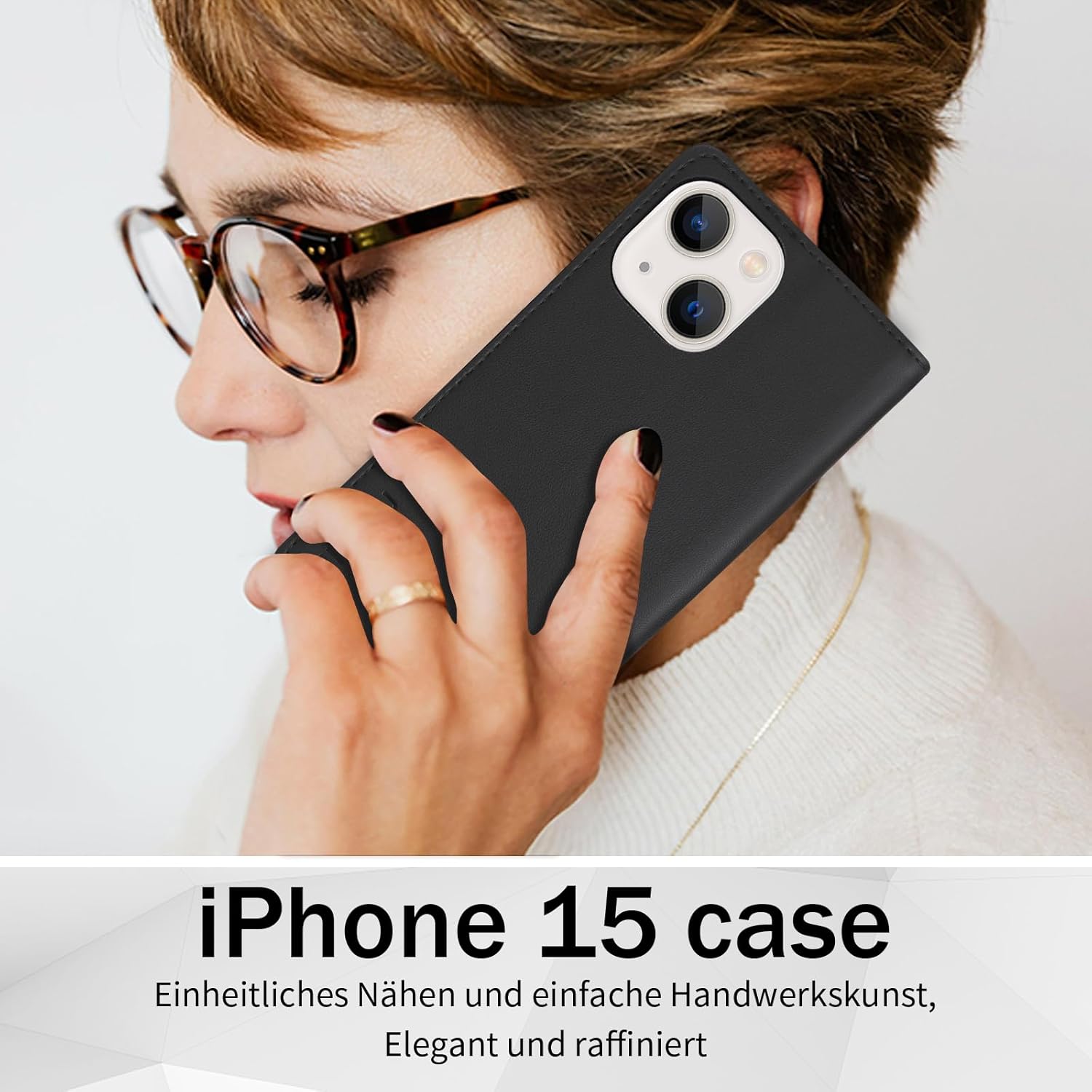 【Premium PU Leder】- Diese für iPhone 15 Hülle Klappbar ist handgemacht aus hochwertiges PU Leder und die Innenschale besteht aus TPU Silikon.Saubere Nähte, weiche Textur und schnelle Wärmeableitung. Verstärkte TPU-Schale ist softer als die normale Innenschale wie PC und bietet gleichzeitig einen hervorragenden Schutz für Handys