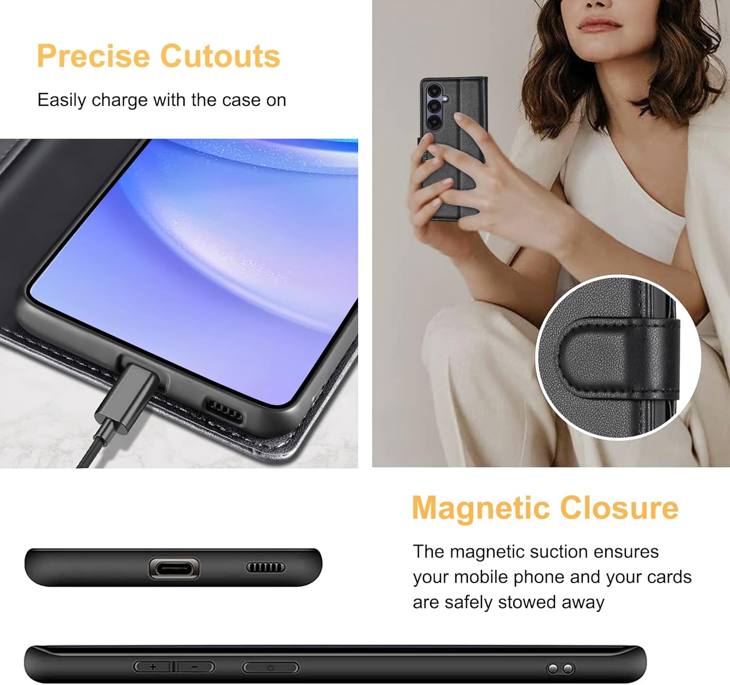 ✅【Einzigartiges Wallet Design】 Diese Samsung A15 Hülle als perfekte Kombination von Handyhülle und Brieftasche. So haben Sie bequem die Hände frei! Mit 4 Kartenfach und 1 Portemonnaiefach, für Bankkarte,Kreditkarten, Quittungen und einige Banknoten sicher aufbewahren, und leicht durch verstecktem magnetverschluss geöffnet und geschlossen werden, um die sichere Aufbewahrung von Telefon und Karten zu gewährleiste.(Eingebautes Anti-RFID)