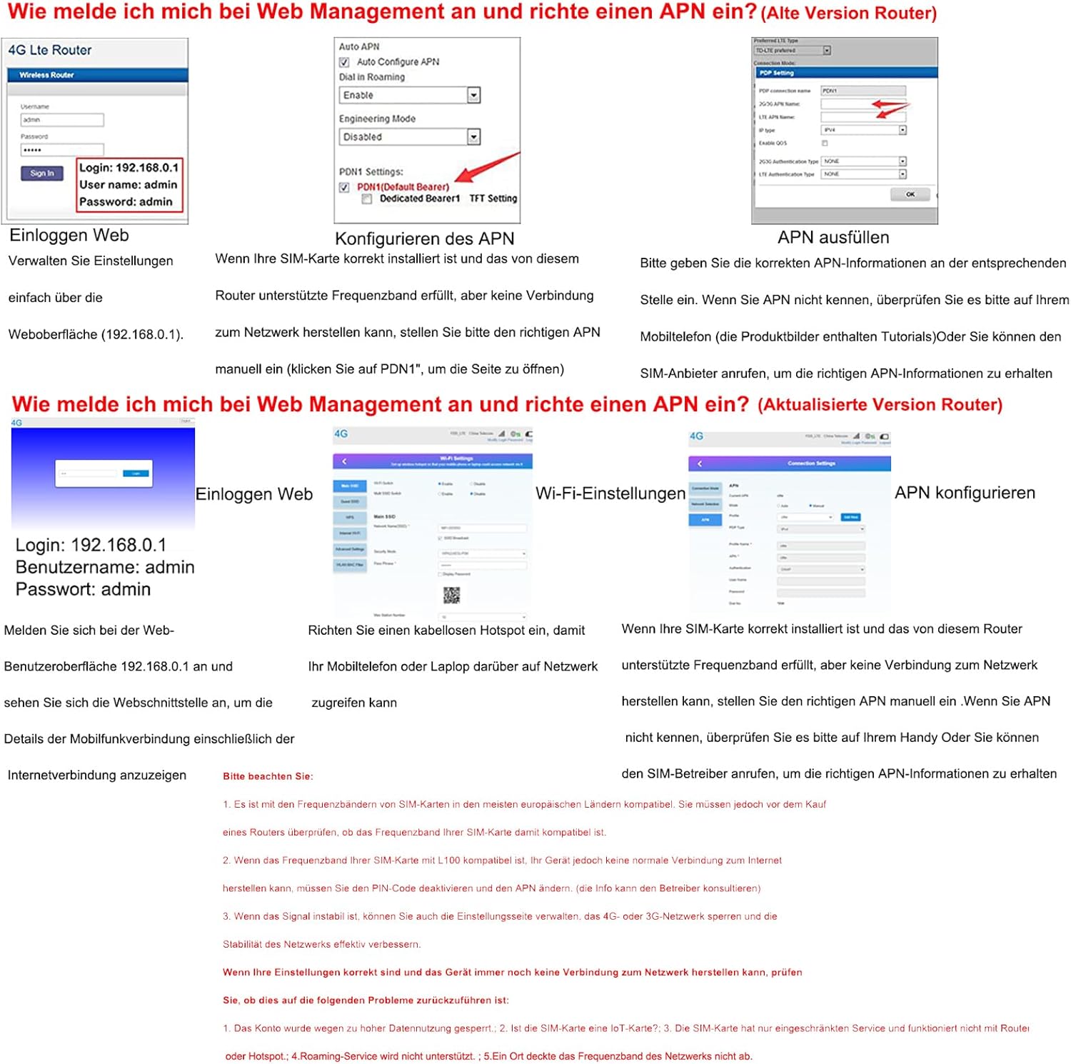 Unsere Router ist geeignet für 95% der SIMKarten in Europa, aber wenn Sie die restlichen 5% sind,oder haben Probleme wie SIM-Karte kann nicht mit dem Netzwerk zu verbinden,können Sie mich in der Zeit zu kontaktieren,werden wir Ihnen helfen, wie zu bedienen,um es zu benutzen.bedienen und zu verwenden