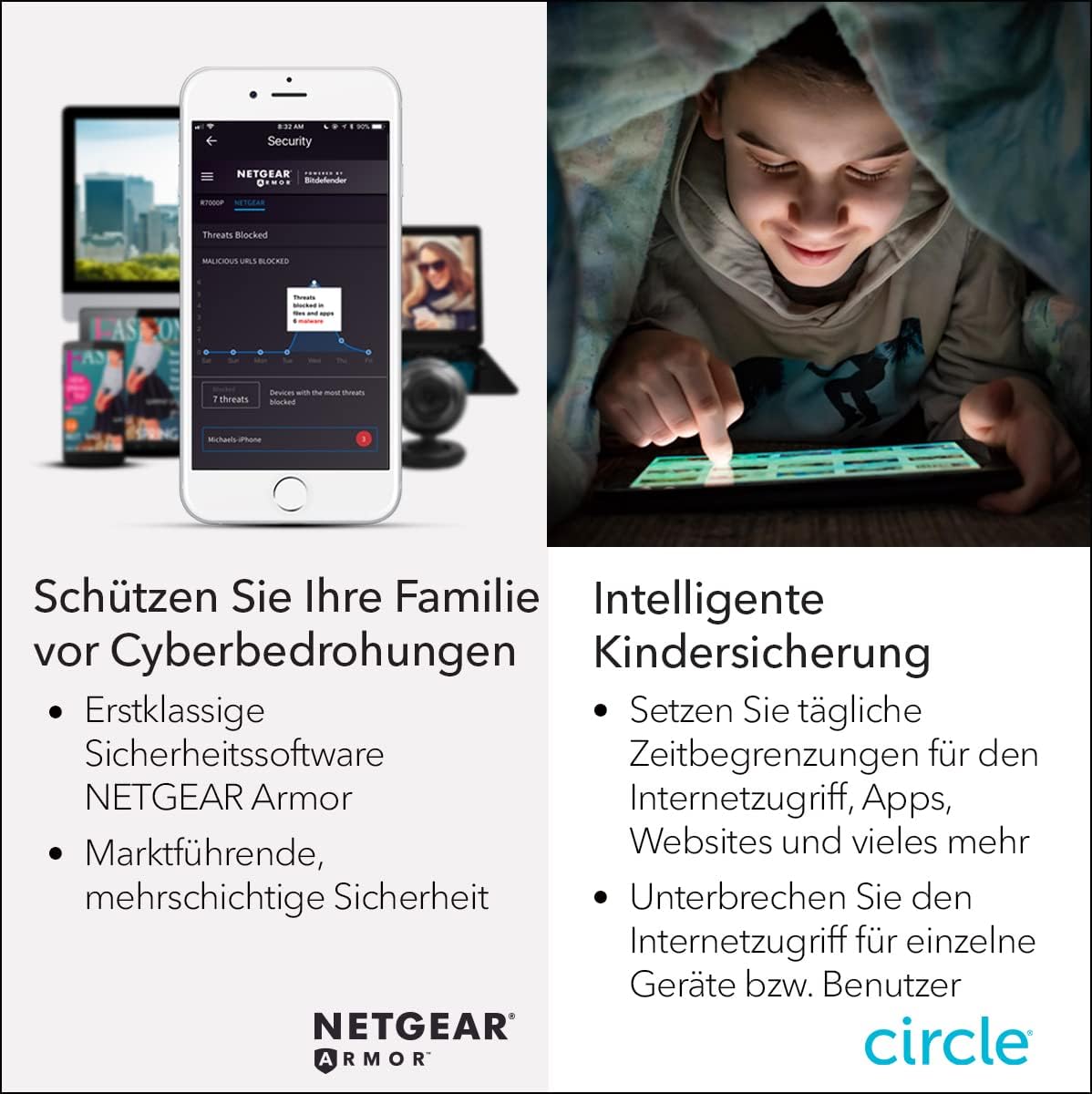 NETGEAR Armor schützt mit mehrschichtiger Sicherheitssoftware die Geräte erstklassig vor Viren, Malware und Datendiebstahl. Verwenden Sie die intelligente Kindersicherung Circle, um den Internetzugriff einfach zu unterbrechen oder Zeitpläne und Webseitenfilter festzulegen.
