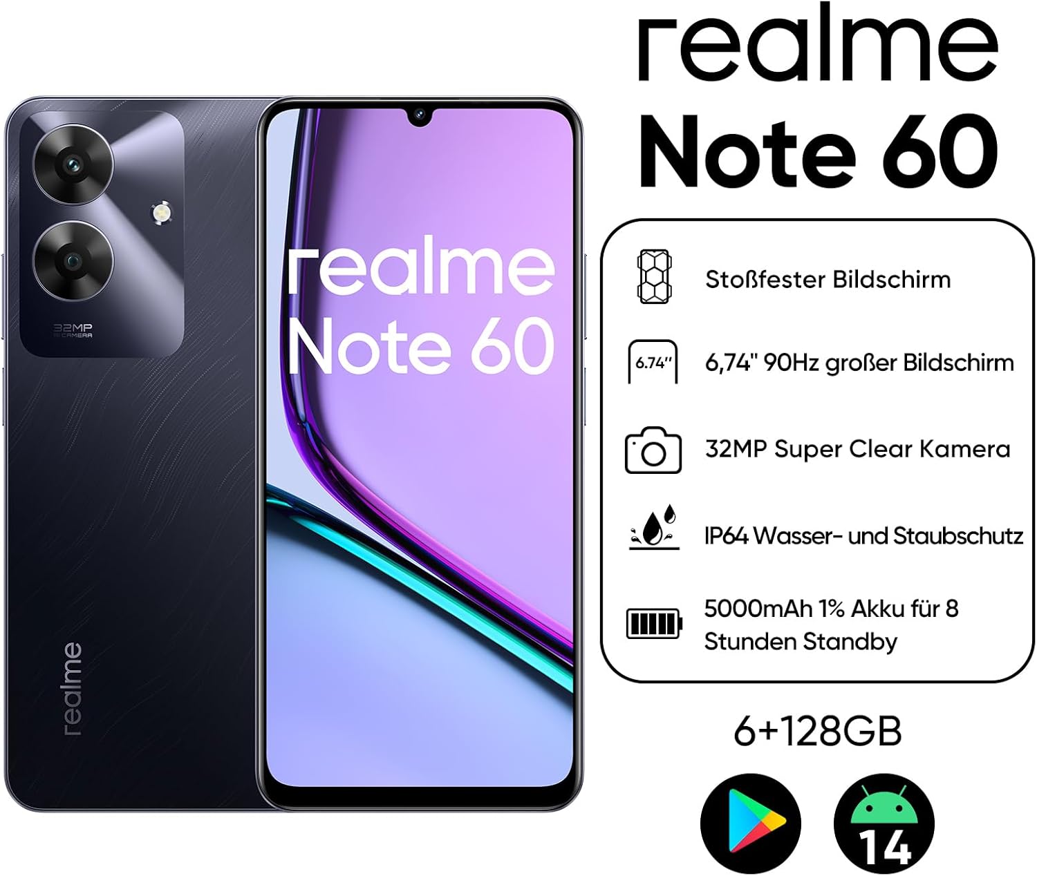 32 MP Kamera: Im Vergleich zur vorherigen Generation ermöglicht Note 60 eine 146% höhere Pixelmenge für schärfere und detailgetreue Aufnahmen. Und dank der Kombination mit fortschrittlichen Fotoalgorithmen erfasst Note 60 genauere und realistischere Farben.